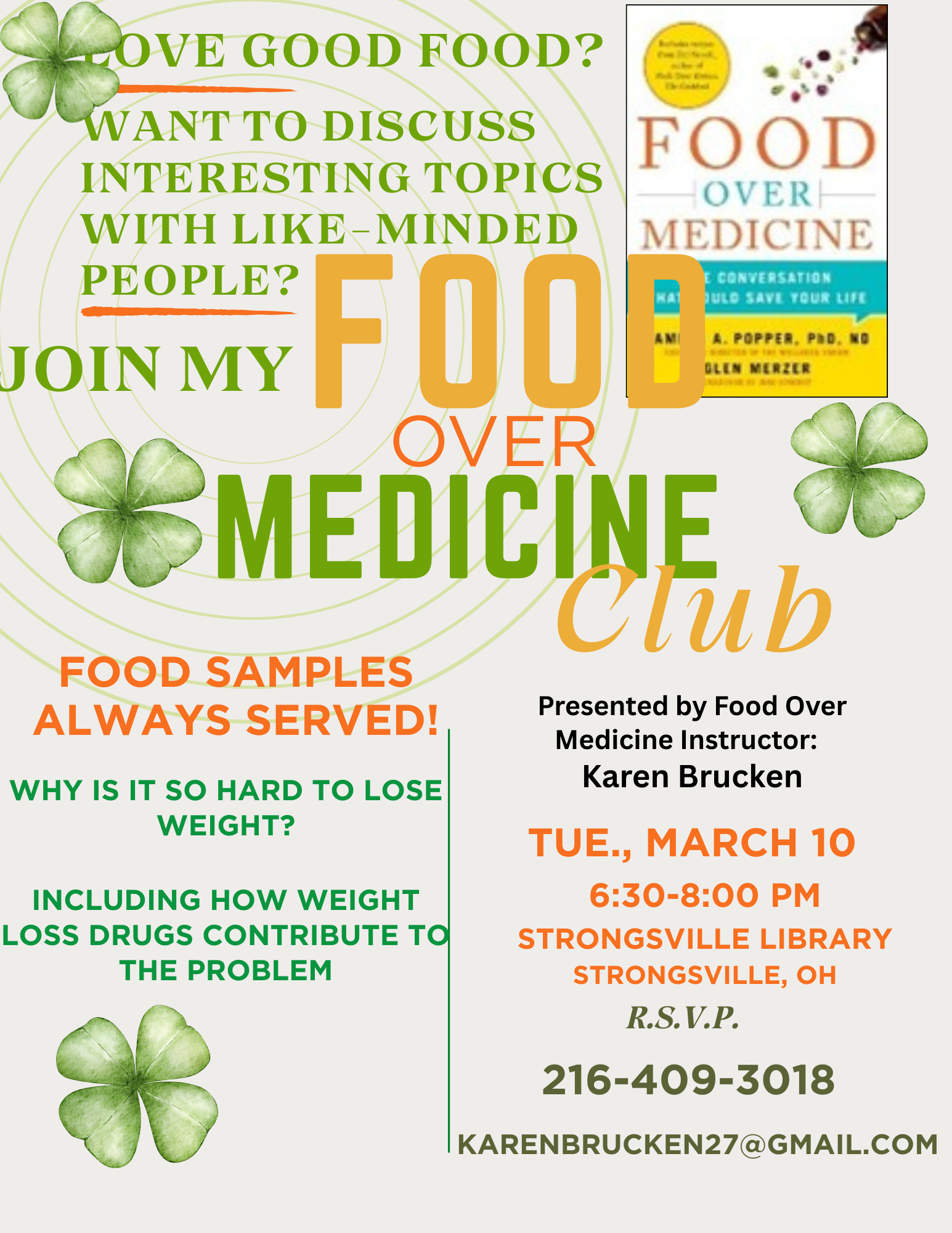 Our next meeting is Tuesday, March 10 at 6:30 pm at the Strongsville (OH) Library. We will be learning why it is so hard to lose weight. Included in the discussion will be the current weight loss medications. Come ready to learn something new!